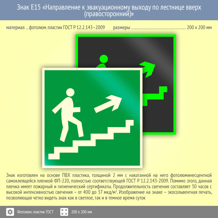 Знак E15 «Направление к эвакуационному выходу по лестнице вверх (правосторонний)» (фотолюминесцентный пластик ГОСТ 34428-2018, 200х200 мм) в Улан-Удэ купить