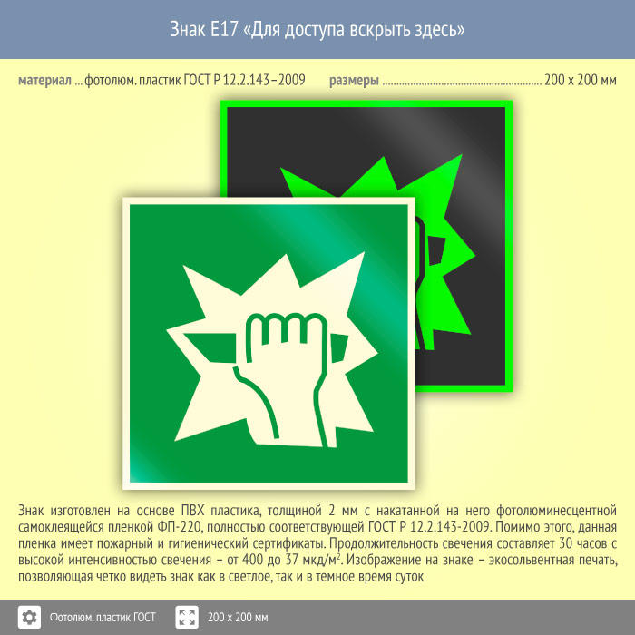Знак E17 «Для доступа вскрыть здесь» (фотолюминесцентный пластик ГОСТ 34428-2018, 200х200 мм) в Улан-Удэ купить