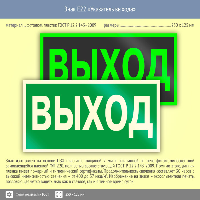 Знак E22 «Указатель выхода» (фотолюминесцентный пластик ГОСТ 34428-2018, 250х125 мм) в Улан-Удэ купить