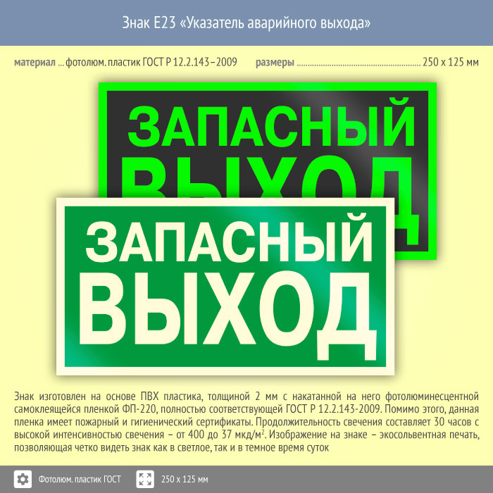 Знак E23 «Указатель запасного выхода» (устаревший) (фотолюминесцентный пластик ГОСТ 34428-2018, 250х125 мм) в Улан-Удэ купить