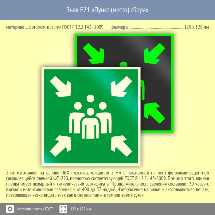 Знак E21 «Пункт (место) сбора» (фотолюминесцентный пластик ГОСТ 34428-2018, 125х125 мм) в Улан-Удэ купить