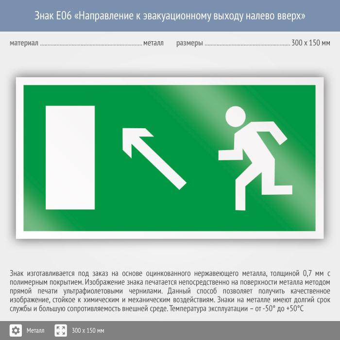 Знак E06 «Направление к эвакуационному выходу налево вверх» (металл, 300х150 мм) в Улан-Удэ купить