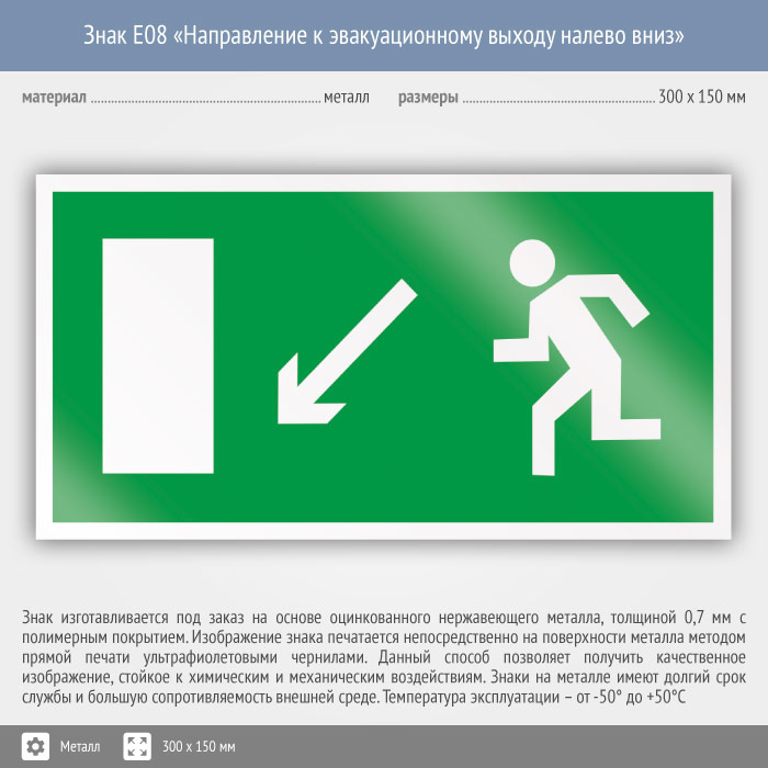 Знак E08 «Направление к эвакуационному выходу налево вниз» (металл, 300х150 мм) в Улан-Удэ купить