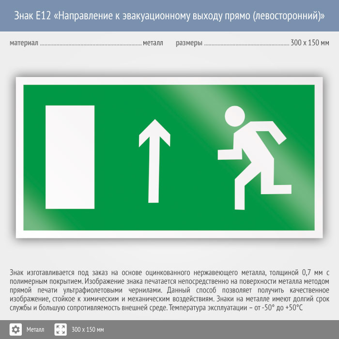 Знак E12 «Направление к эвакуационному выходу прямо (левосторонний)» (металл, 300х150 мм) в Улан-Удэ купить