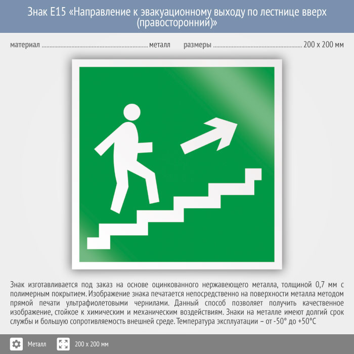 Знак E15 «Направление к эвакуационному выходу по лестнице вверх (правосторонний)» (металл, 200х200 мм) в Улан-Удэ купить