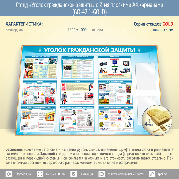 Стенд «Уголок гражданской защиты» с 2-мя плоскими А4 карманами (GO-42.1-GOLD) в Улан-Удэ купить