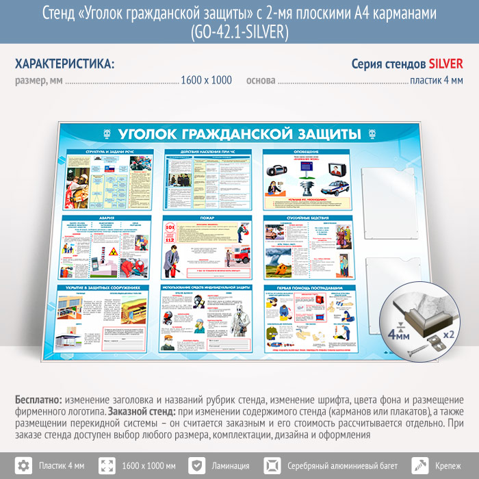 Стенд «Уголок гражданской защиты» с 2-мя плоскими А4 карманами (GO-42.1-SILVER) в Улан-Удэ купить