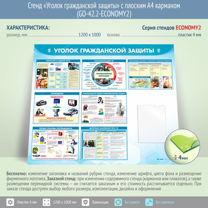 Стенд «Уголок гражданской защиты» с плоским А4 карманом (GO-42.2-ECONOMY2) в Улан-Удэ купить