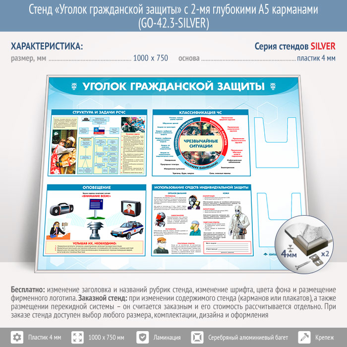Стенд «Уголок гражданской защиты» с 2-мя глубокими А5 карманами (GO-42.3-SILVER) в Улан-Удэ купить