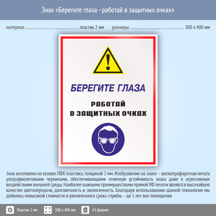 Знак «Берегите глаза - работай в защитных очках», КЗ-04 (пластик, 300х400 мм) в Улан-Удэ купить