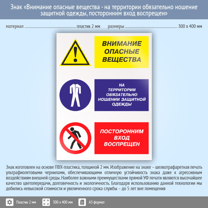 Знак «Внимание опасные вещества - на территории обязательно ношение защитной одежды, посторонним вход воспрещен», КЗ-15 (пластик, 300х400 мм) в Улан-Удэ купить