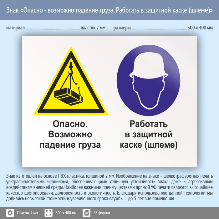 Знак «Опасно - возможно падение груза. Работать в защитной каске (шлеме)», КЗ-34 (пластик, 400х300 мм) в Улан-Удэ купить