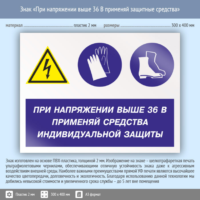 Знак «При напряжении выше 36 В применяй защитные средства», КЗ-71 (пластик, 400х300 мм) в Улан-Удэ купить