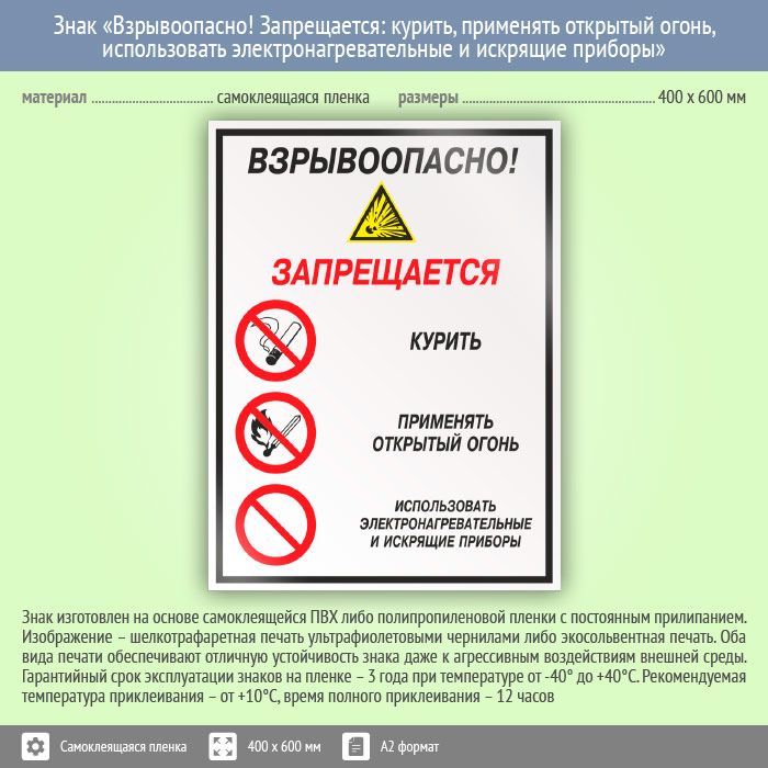 Знак «Взрывоопасно! Запрещается: курить, применять открытый огонь, использовать электронагревательные и искрящие приборы», КЗ-10 (пленка, 400х600 мм) в Улан-Удэ купить