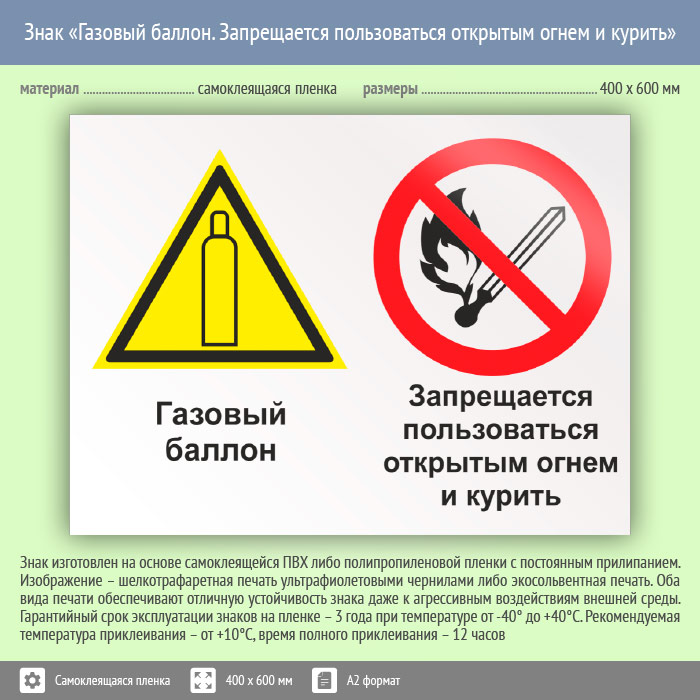 Знак «Газовый баллон. Запрещается пользоваться открытым огнем и курить», КЗ-19 (пленка, 600х400 мм) в Улан-Удэ купить