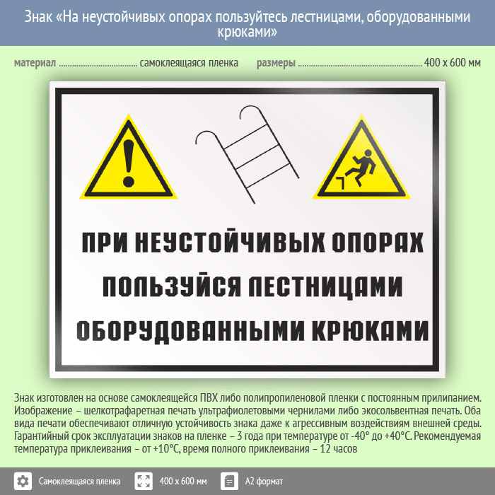 Знак «На неустойчивых опорах пользуйтесь лестницами, оборудованными крюками», КЗ-22 (пленка, 600х400 мм) в Улан-Удэ купить