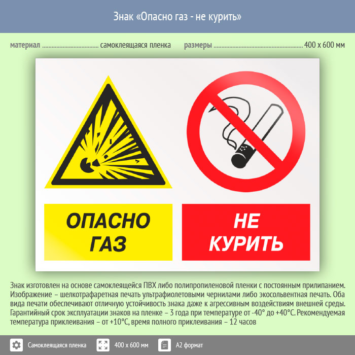 Знак «Опасно газ - не курить», КЗ-44 (пленка, 600х400 мм) в Улан-Удэ купить