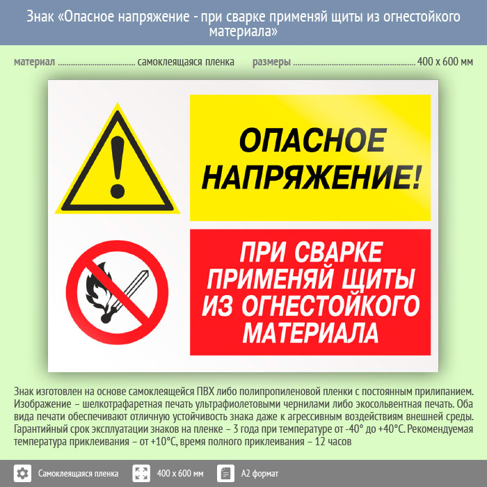 Знак «Опасное напряжение - при сварке применяй щиты из огнестойкого материала», КЗ-46 (пленка, 600х400 мм) в Улан-Удэ купить