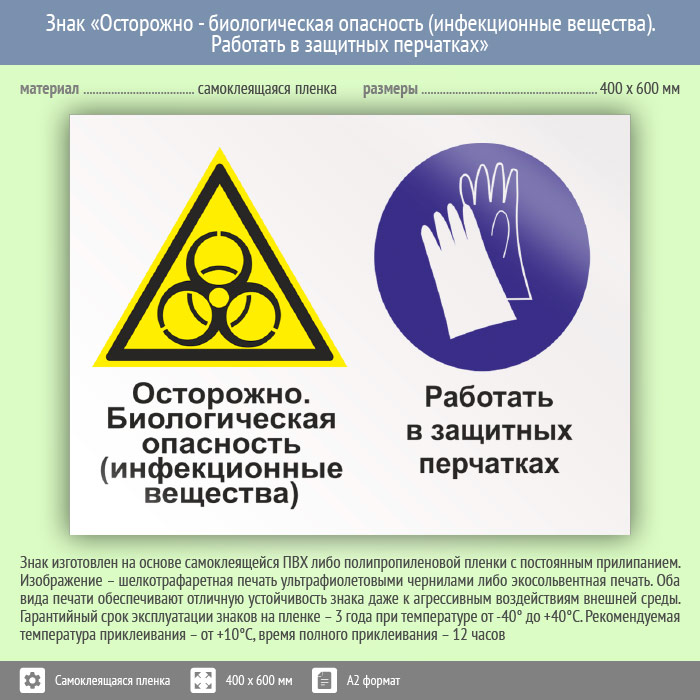 Знак «Осторожно - биологическая опасность (инфекционные вещества). Работать в защитных перчатках», КЗ-52 (пленка, 600х400 мм) в Улан-Удэ купить