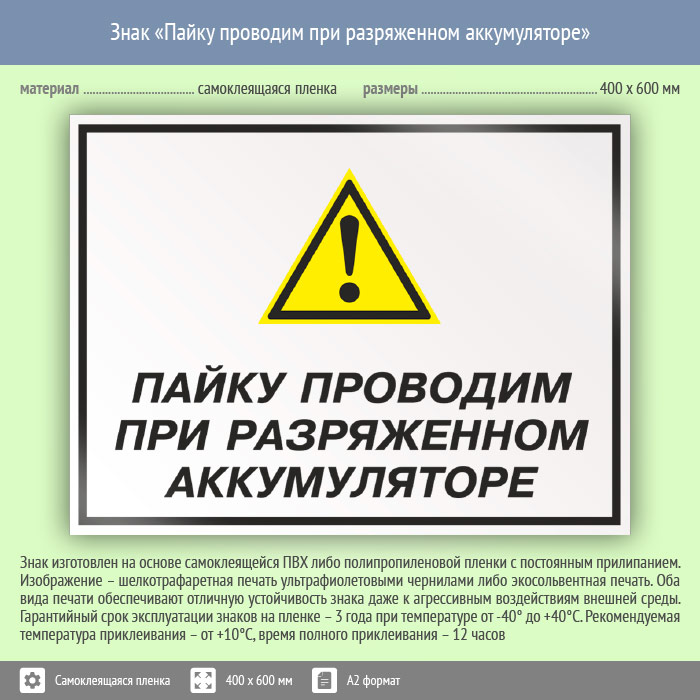 Знак «Пайку проводим при разряженном аккумуляторе», КЗ-62 (пленка, 600х400 мм) в Улан-Удэ купить