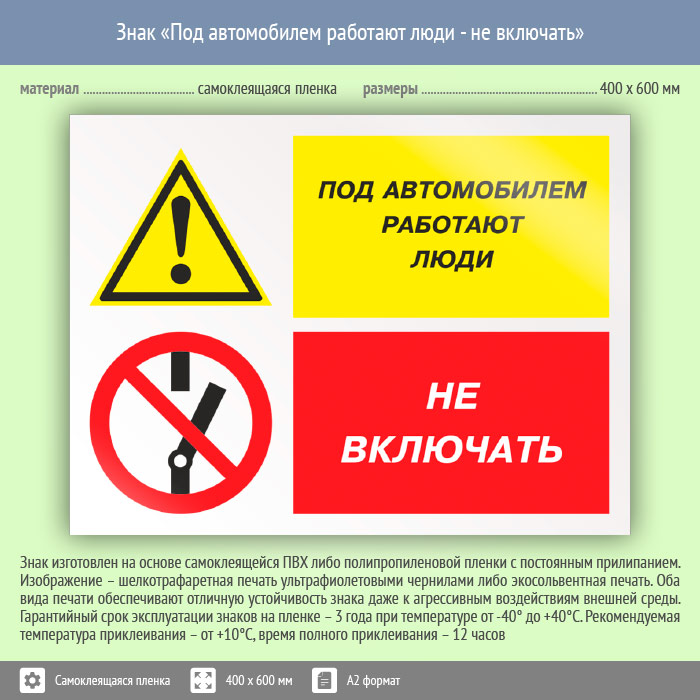 Знак «Под автомобилем работают люди - не включать», КЗ-65 (пленка, 600х400 мм) в Улан-Удэ купить