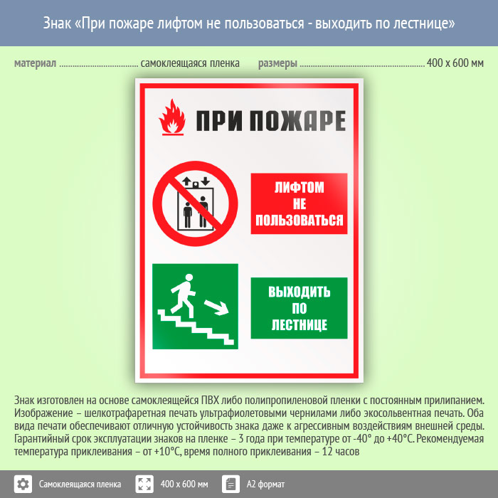 Знак «При пожаре лифтом не пользоваться - выходить по лестнице», КЗ-73 (пленка, 400х600 мм) в Улан-Удэ купить