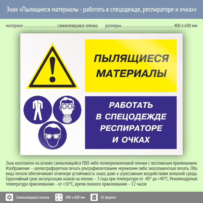 Знак «Пылящиеся материалы - работать в спецодежде, респираторе и очках», КЗ-79 (пленка, 600х400 мм) в Улан-Удэ купить