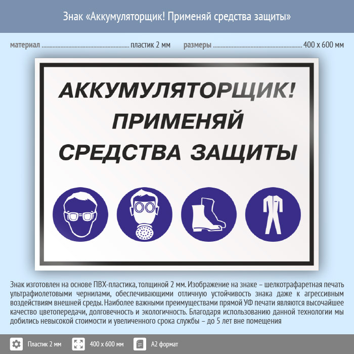 Знак «Аккумуляторщик! Применяй средства защиты», КЗ-02 (пластик, 600х400 мм) в Улан-Удэ купить