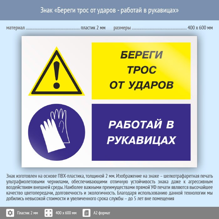 Знак «Береги трос от ударов - работай в рукавицах», КЗ-03 (пластик, 600х400 мм) в Улан-Удэ купить