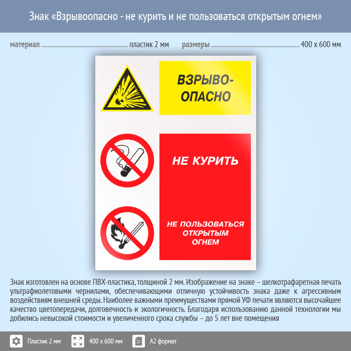 Знак «Взрывоопасно - не курить и не пользоваться открытым огнем», КЗ-08 (пластик, 400х600 мм) в Улан-Удэ купить