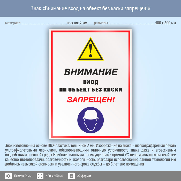 Знак «Внимание вход на объект без каски запрещен!», КЗ-13 (пластик, 400х600 мм) в Улан-Удэ купить