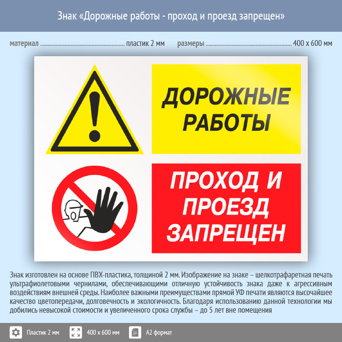 Знак «Дорожные работы - проход и проезд запрещен», КЗ-20 (пластик, 600х400 мм) в Улан-Удэ купить