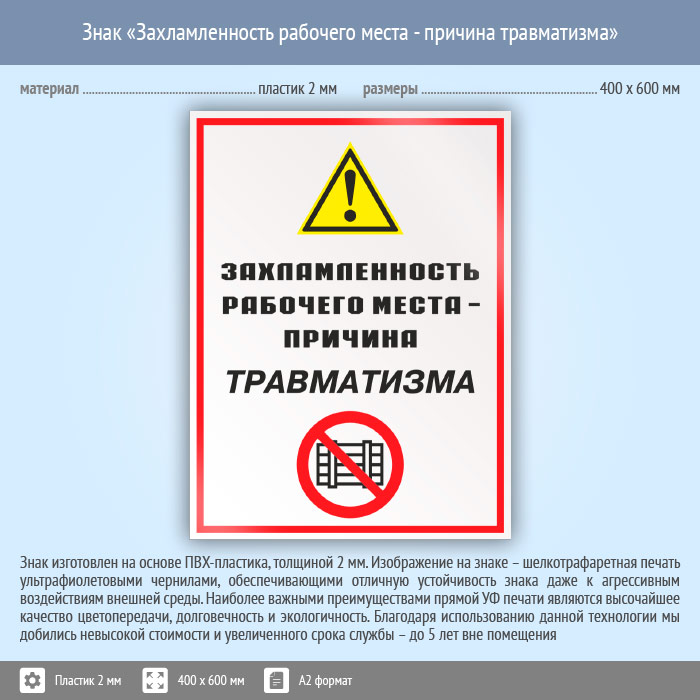 Знак «Захламленность рабочего места - причина травматизма», КЗ-21 (пластик, 400х600 мм) в Улан-Удэ купить