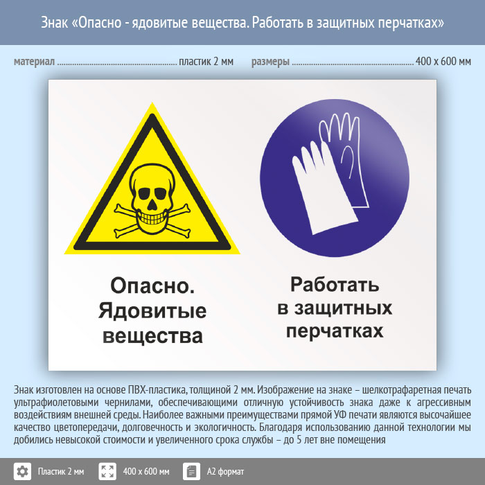 Знак «Опасно - ядовитые вещества. Работать в защитных перчатках», КЗ-43 (пластик, 600х400 мм) в Улан-Удэ купить