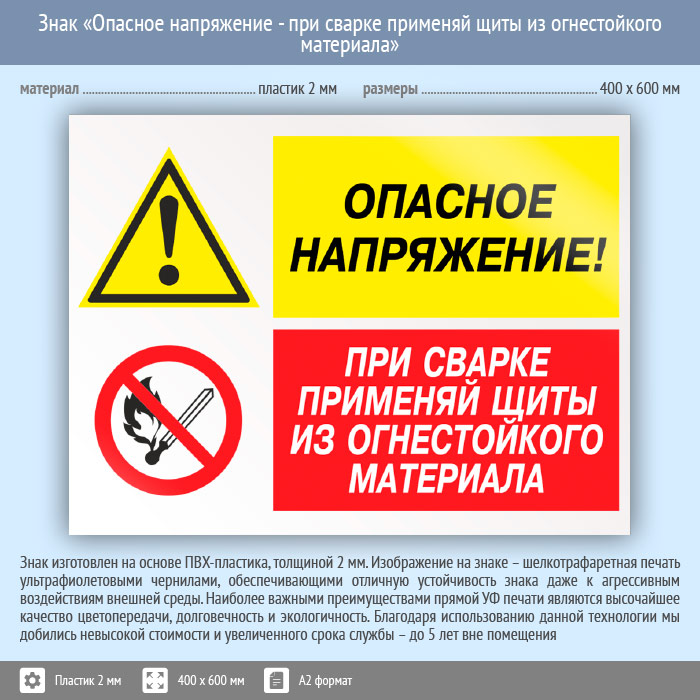 Знак «Опасное напряжение - при сварке применяй щиты из огнестойкого материала», КЗ-46 (пластик, 600х400 мм) в Улан-Удэ купить