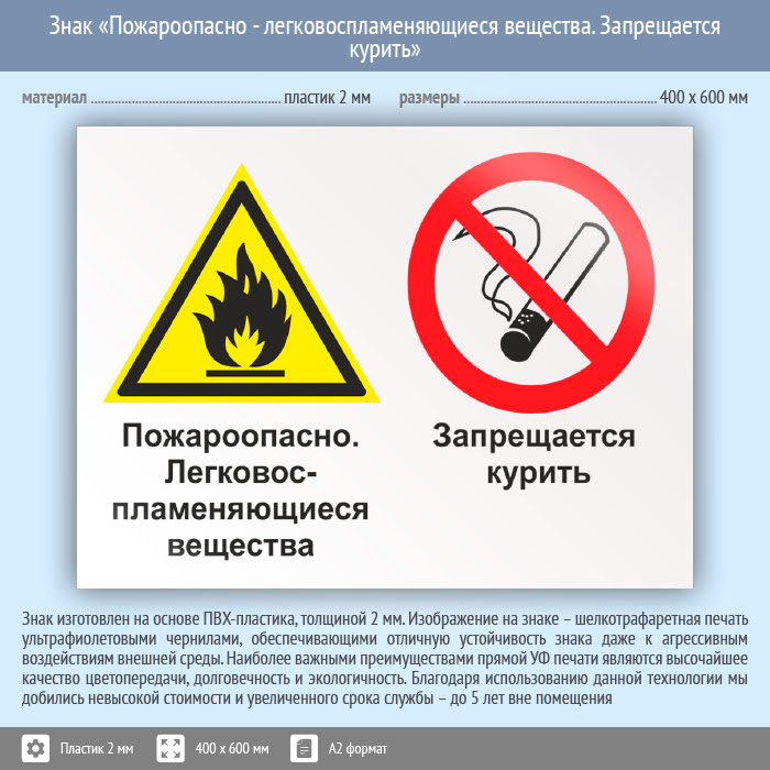 Знак «Пожароопасно - легковоспламеняющиеся вещества. Запрещается курить», КЗ-69 (пластик, 600х400 мм) в Улан-Удэ купить