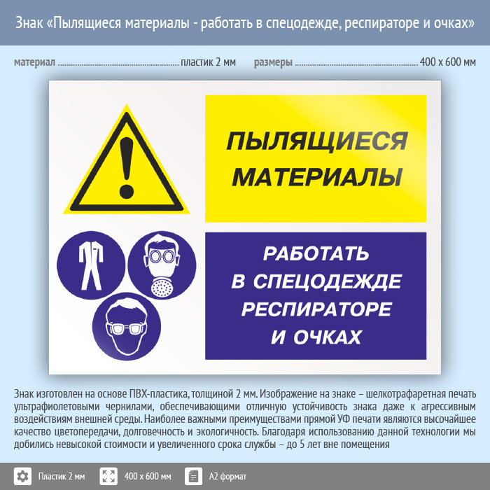 Знак «Пылящиеся материалы - работать в спецодежде, респираторе и очках», КЗ-79 (пластик, 600х400 мм) в Улан-Удэ купить