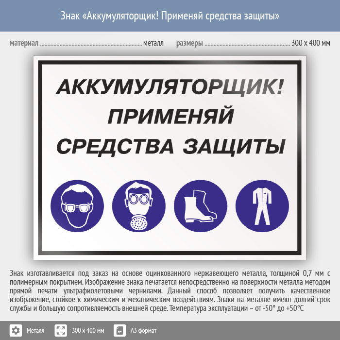 Знак «Аккумуляторщик! Применяй средства защиты», КЗ-02 (металл, 400х300 мм) в Улан-Удэ купить