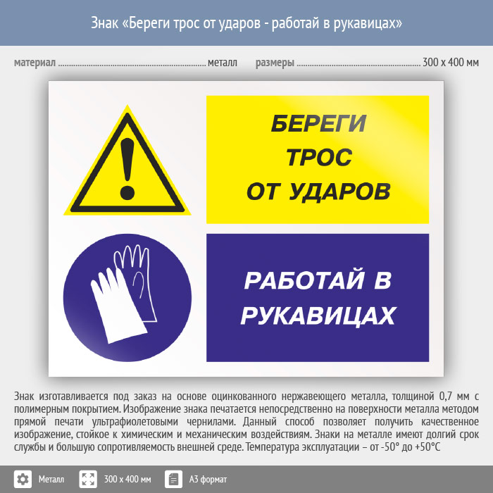 Знак «Береги трос от ударов - работай в рукавицах», КЗ-03 (металл, 400х300 мм) в Улан-Удэ купить