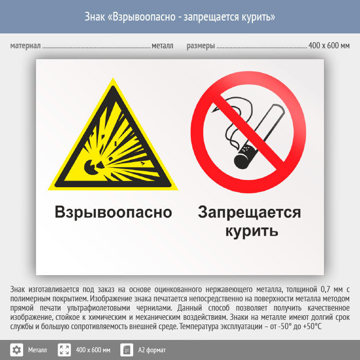 Знак «Взрывоопасно - запрещается курить», КЗ-06 (металл, 600х400 мм) в Улан-Удэ купить