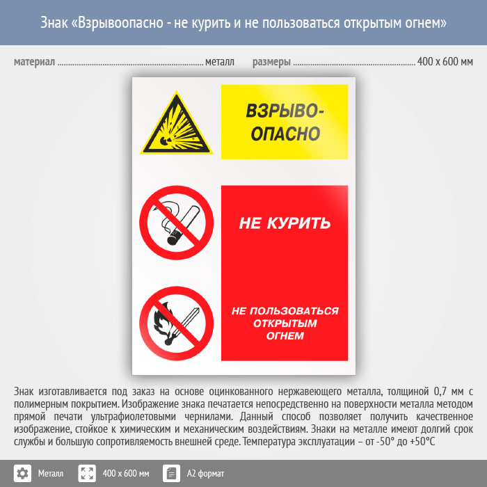 Знак «Взрывоопасно - не курить и не пользоваться открытым огнем», КЗ-08 (металл, 400х600 мм) в Улан-Удэ купить