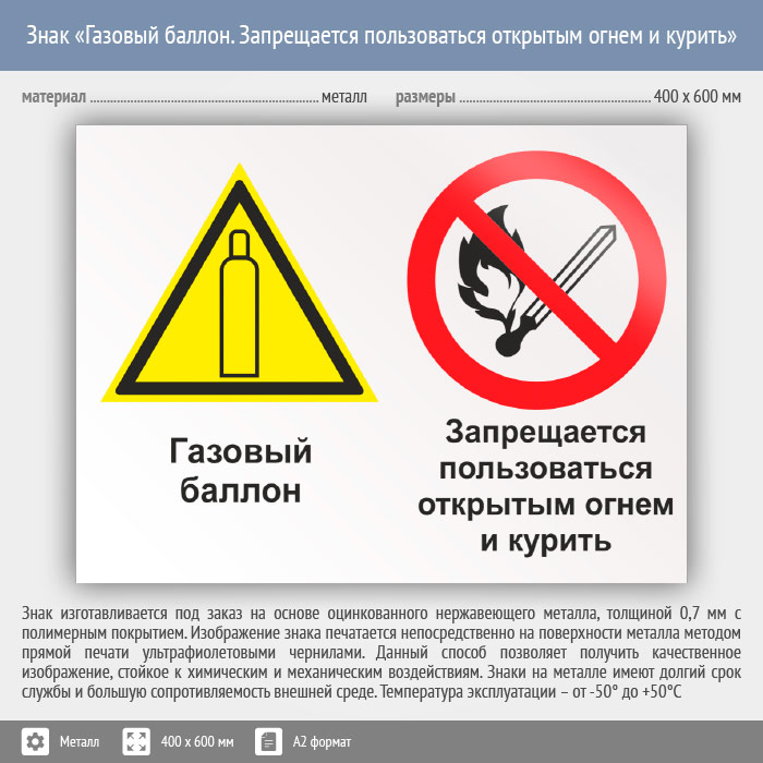 Знак «Газовый баллон. Запрещается пользоваться открытым огнем и курить», КЗ-19 (металл, 600х400 мм) в Улан-Удэ купить