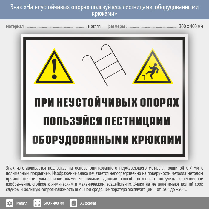Знак «На неустойчивых опорах пользуйтесь лестницами, оборудованными крюками», КЗ-22 (металл, 400х300 мм) в Улан-Удэ купить