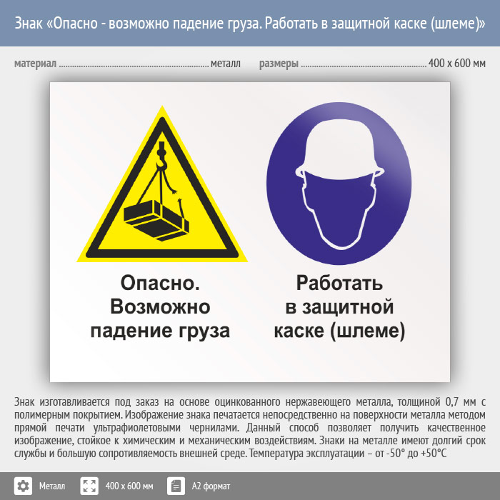 Знак «Опасно - возможно падение груза. Работать в защитной каске (шлеме)», КЗ-34 (металл, 600х400 мм) в Улан-Удэ купить