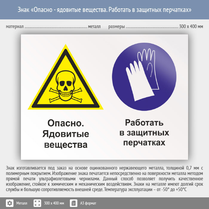 Знак «Опасно - ядовитые вещества. Работать в защитных перчатках», КЗ-43 (металл, 400х300 мм) в Улан-Удэ купить