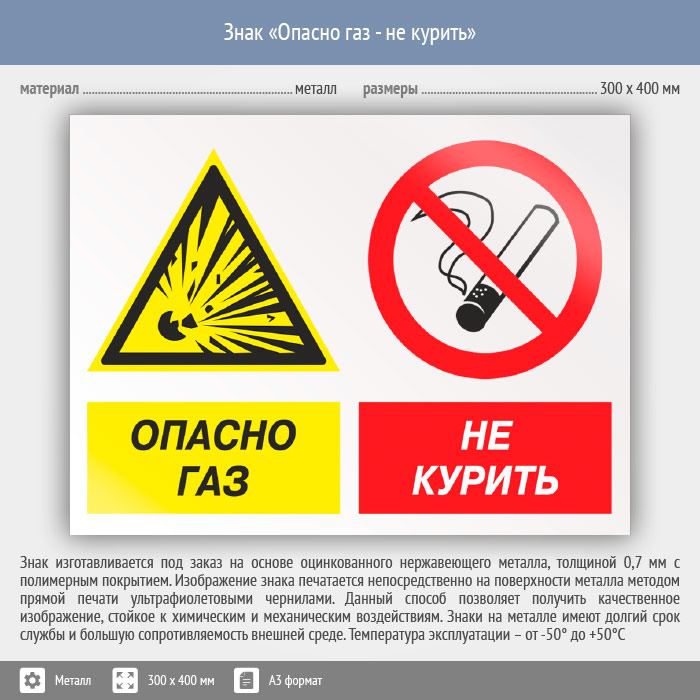 Знак «Опасно газ - не курить», КЗ-44 (металл, 400х300 мм) в Улан-Удэ купить