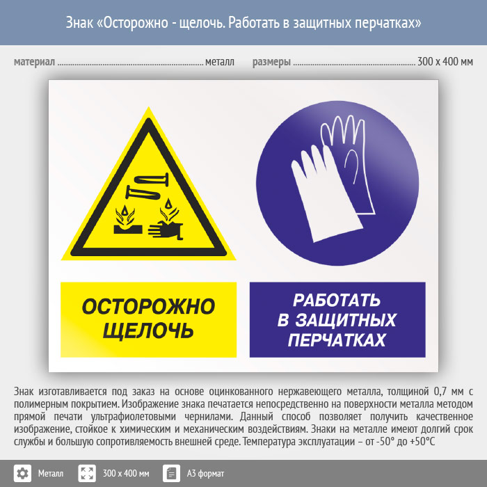 Знак «Осторожно - щелочь. Работать в защитных перчатках», КЗ-60 (металл, 400х300 мм) в Улан-Удэ купить