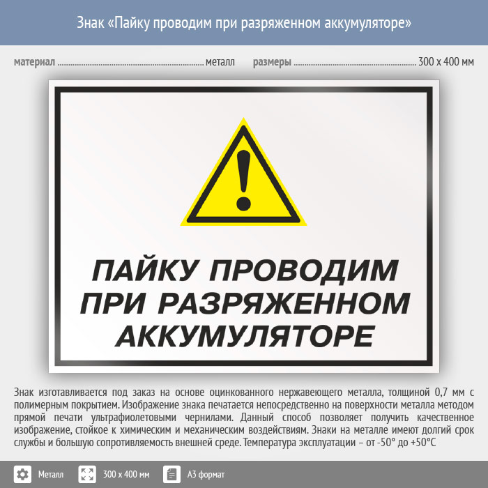 Знак «Пайку проводим при разряженном аккумуляторе», КЗ-62 (металл, 400х300 мм) в Улан-Удэ купить
