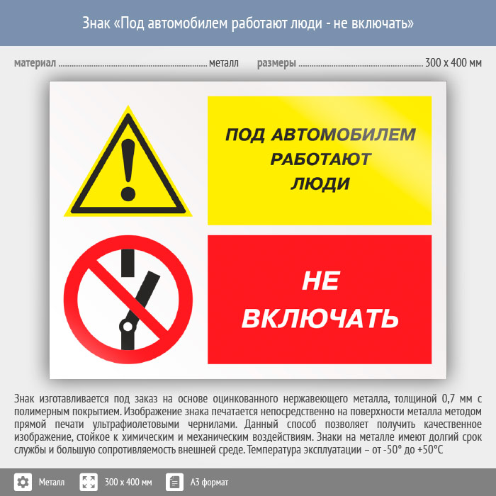 Знак «Под автомобилем работают люди - не включать», КЗ-65 (металл, 400х300 мм) в Улан-Удэ купить