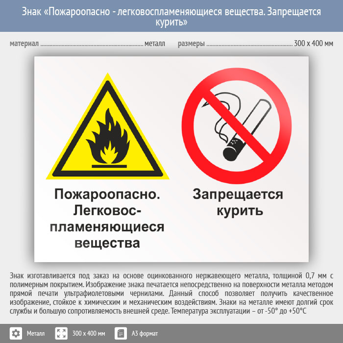 Знак «Пожароопасно - легковоспламеняющиеся вещества. Запрещается курить», КЗ-69 (металл, 400х300 мм) в Улан-Удэ купить